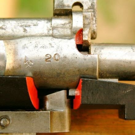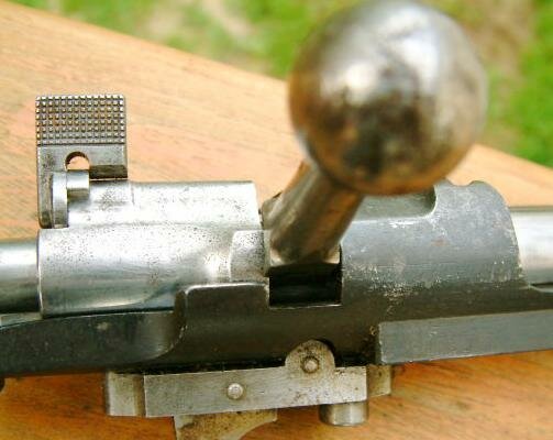 The safety lever cams the cocking piece away from the sear and blocks its forward movement. In many rifles the safety is difficult or impossible to engage. This can sometimes be adjusted by stoning the camming angle to allow it to pick up the cocking piece. The Mauser system safety is about as perfect a safety as can be devised. Initially utilized via a patent by Paul Mauser on the Infantry Gewehr 1871 it has remained virtually unchanged throughout the entire series of Mauser military rifles. Personally, I dislike those sporting safeties that act on the trigger, as the cocking piece is still engaged with the sear and accidental discharge can occur.