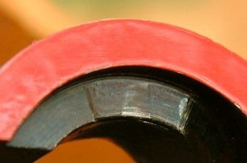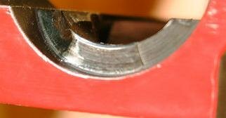 This close-up shows the tearing of the chamber by a dull chambering reamer, just below the neck and in the neck area. The "smushed" rifling in front of the chamber neck is the leade, or throat. The longitudinal lines in the grooves are from the rifling cutter, and the radial marks on top of the lands are from the precision reaming of the bore diameter prior to rifling.