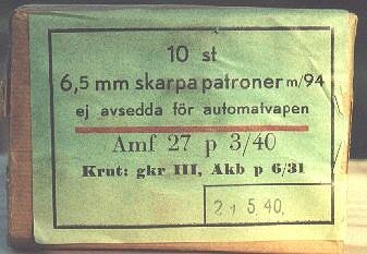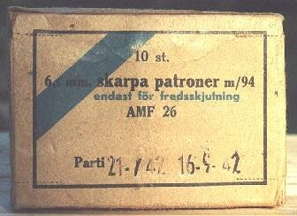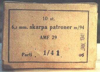 The m/94 cartridge was issued in this 10 round cardboard box, with 2 stripper clips.