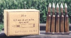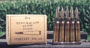 This is the most commonly available Swedish surplus cartridge with it's 139 grain (9 grams) boattail bullet. Originally developed for the m/41 sniper rifles, it replaced the m/94 bullet for general use. Velocity is 2592 fps (790 m/s) in the m/96 rifle.