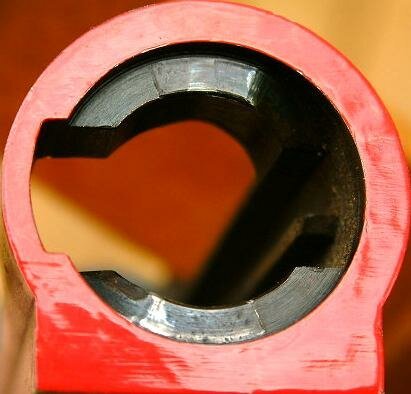 The barrel threads were cut off revealing the bolt lug races. Notice the uneven wear on the lower lug race compared to the upper race.
