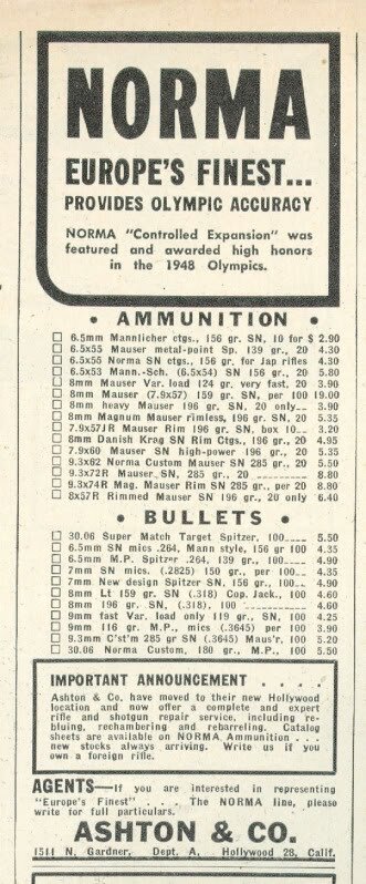 Figure 5. Advertisement for Norma ammo including 8x58RD from 1949 American Rifleman.