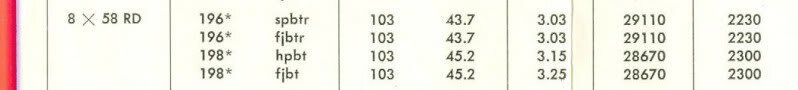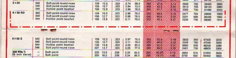 Interesting that; in any case, there is something odd about the 8x58RD load listing. In the Norma chart, there are numerous attribute listings that are blank. These missing attributes or values are as follows: