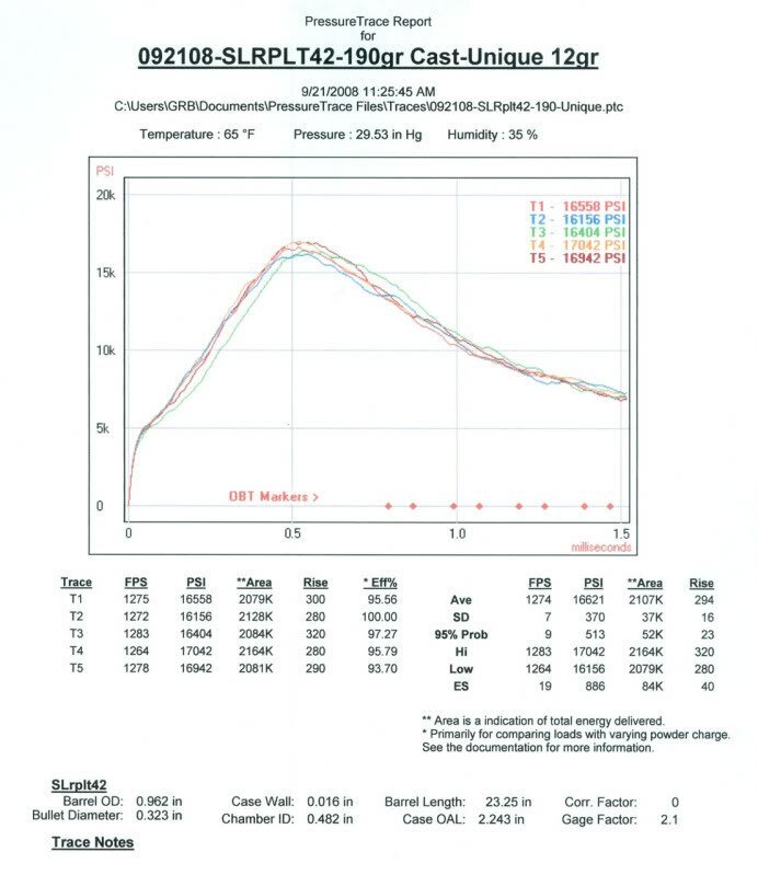 The last graph is what I call my plinking load for use in both rolling blocks and K-J rifles. No it is not a supersonic moose annihilator, but why should it be? It is a fun load and will let my treasured Scandinavian rifles shoot on for many years to come. The bullet is a 190gr gas checked cast bullet from Mt. Baldy Bullets in Cody, WY. The powder is the great old standard for turn of the 19th century rifle blackpowder and smokeless cartridges, 12gr of Unique. One of my future projects with the Pressure Trace II and chronograph is to work the Unique powder up grain by grain to about 15gr and see what happens. If the measured pressure warrants and accuracy is acceptable a grain or two more of Unique might be added to the recipe.