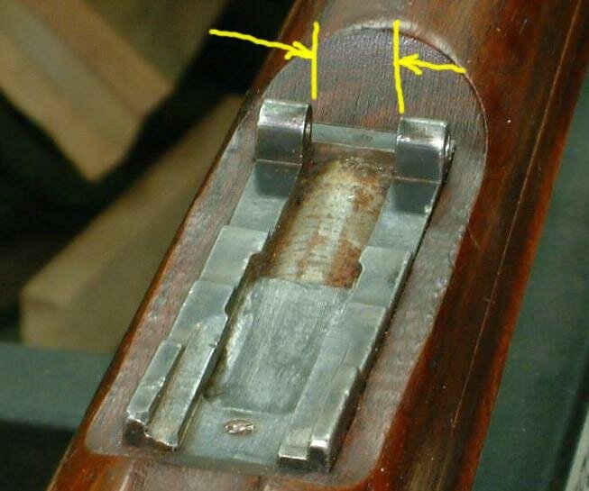 I have 3 loose m/96 rear sight bases and 2 m/96 rifles in the shop. They are not all the same distance between the ladder ears. But this dimensional discrepency is due mostly to injury or damage to the rear sight, or burrs on the metal. Most likely, though, its due to some damage in use or when the rifle was rebarreled and the rear sight base was removed and re-soldered to the new barrel. The back end of the sight base is often smacked to loosen it. This particular rifle bears that damage, though it is 109 years old.