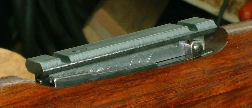 This particular Mauser rear sight is shared with the 1891 Argentine and 1895 Chilean Mauser. When in the down position the elevator slides to the top of the ladder and locks into a dovetail located integral with the ladder spring. This leaves the two edges of the ladder with a perfectly functional clamping surface about 1.8" long. It'll take a prototype to determine if this method of attachment is adequate. The German Commission 1888 and the Japanese Type 99 don't have a similar ladder locking feature.