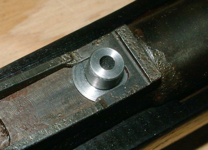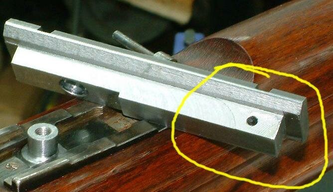 The hole for the pin in the sight base where the sight leaf pivots on isn't really a pin hole. Its one of the Mauser ideas to make sure the rear sight doesn't get lost if the leaf spring breaks and the leaf wants to drop out. There's a tiny diameter pin that protrudes into this hole to keep the sight leaf from being lost. I lathe turned a pin for a close fit and since this hole is pretty good size it lends great strength to the entire mount.