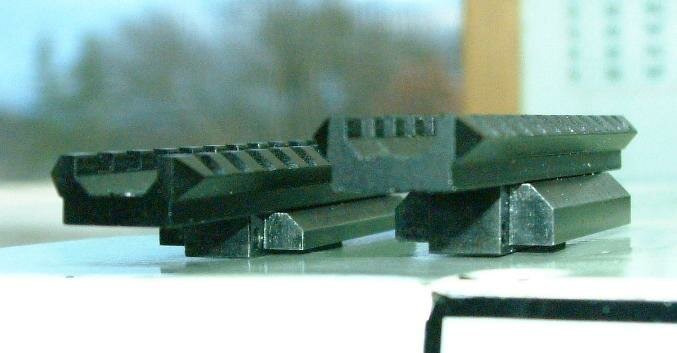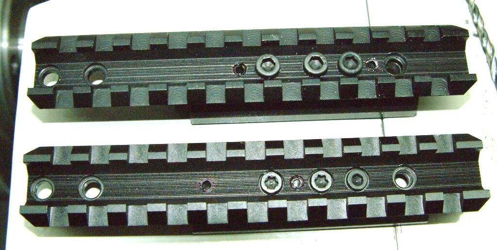 For expedience I used a NcStar rail for the Marlin rifle as it has a flat base and is drilled for mounting holes. The slot configuration is in the mil-std-1913 instead of the Weaver slot spacing. At 4 3/4" long its ideal for this type of application.