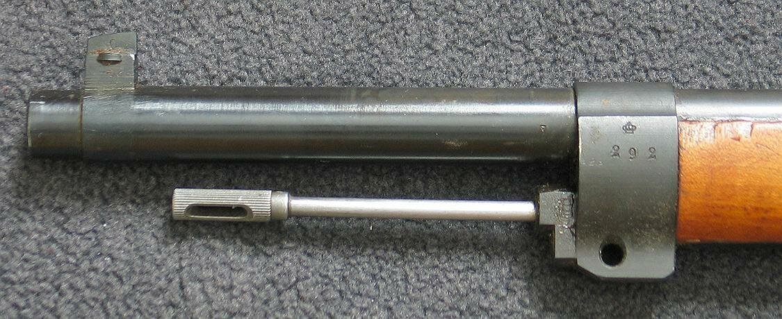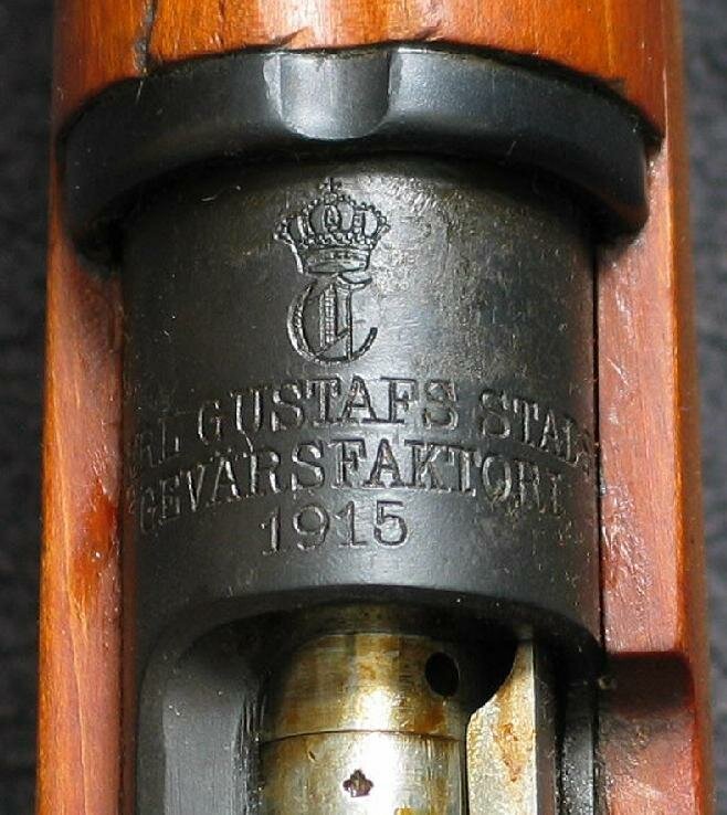 The barrel is marked for Carlsborg army workshop (now Karlsborg). There is a crown/CB cartouche on the wrist. The second little thing is that "flat" on the barrel. That was caused by a barrel vise when the new barrel was installed. We have noted a minority of m/96 with this kind of mark on the barrel shank. We don't have enough data to come to any conclusions about it. At some point it may be traceable to a specific army workshop.