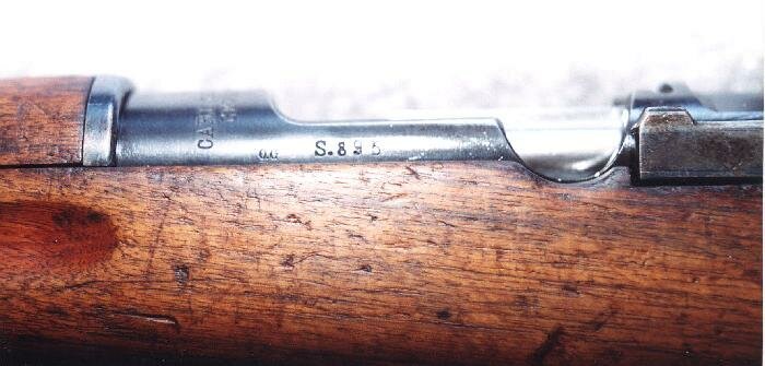 This series of carbines were used by schools and youth organizations. The barrel is stamped with the same "895" as the receiver in addition to a crown/CB stamp, indicating rebarreling a Carlsborg Army depot. The wrist cartouche has the same crown/CB. The stock and handguard are both matching numbers to the receiver. The bolt handle is straight on this model. The grasping grooves are short as with other carbine models. Note the position of the rear sling swivel, more forward towards the triggerguard than the m/94 or m/96.